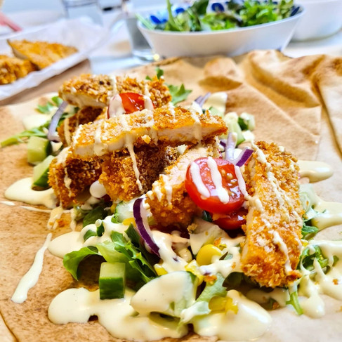 Vänd kycklingen i pankoströbröd och kör i Airfryer i 200 grader i ca 10 min, eller i ugnen i 250 grader i ca 15 min.
